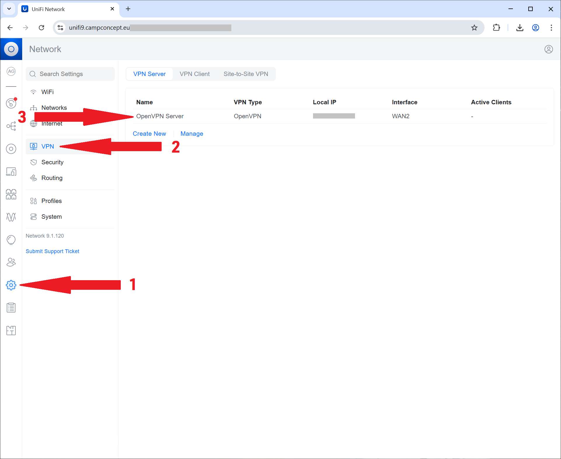 1. OpenVPN-Server in UniFi aufrufen. Melden Sie sich an der UniFi-Weboberfläche an. Navigieren Sie über Einstellungen (Zahnrad-Symbol) (1) → VPN (2) → VPN Server und klicken Sie dort auf den Eintrag OpenVPN Server (3), um die Detailansicht zu öffnen.