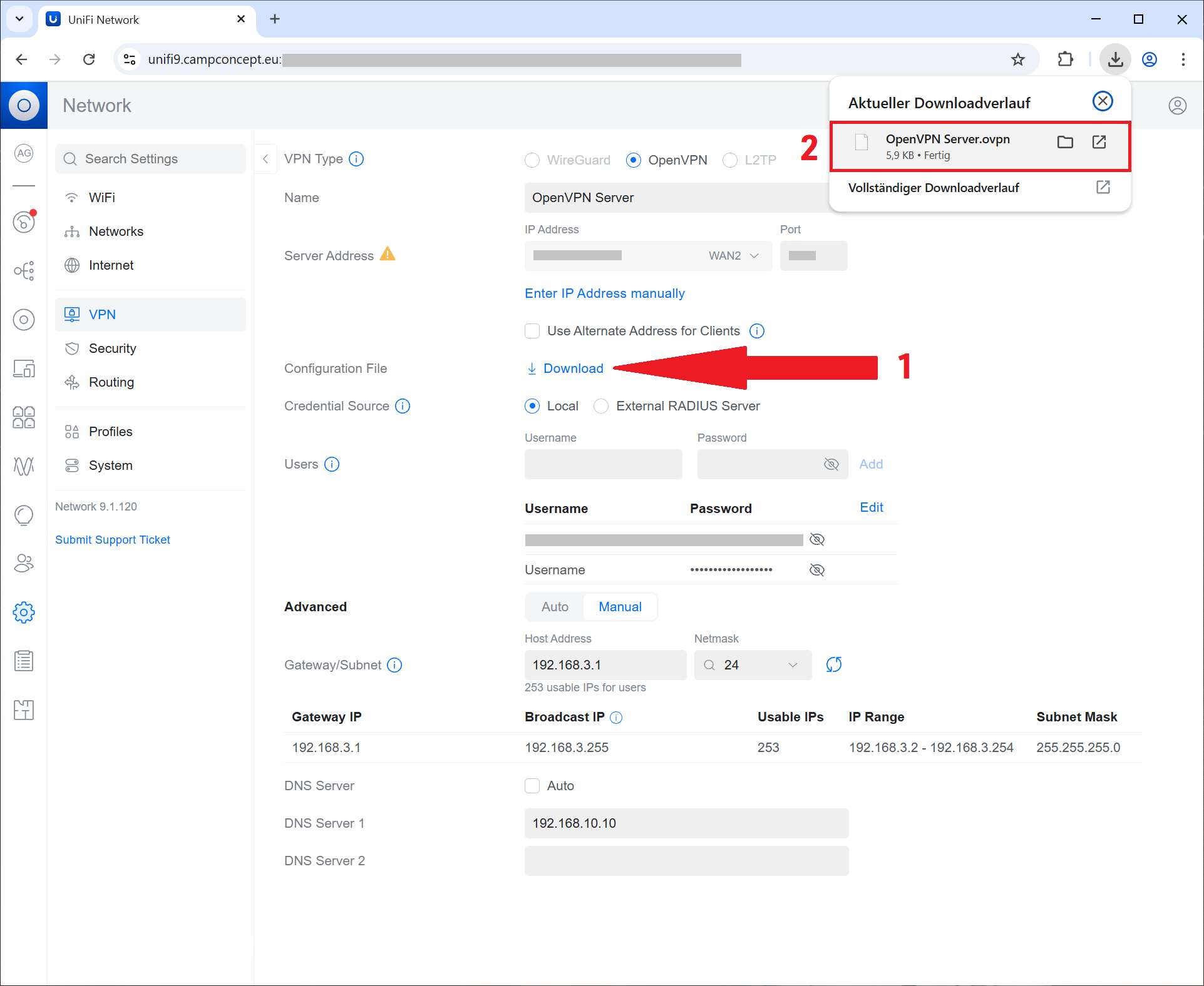 4. Konfigurationsdatei herunterladen. Laden Sie anschließend die Konfigurationsdatei für den OpenVPN-Client herunter. Klicken Sie auf Download (1) und speichern Sie die Datei (*.ovpn) im Download-Ordner (2).