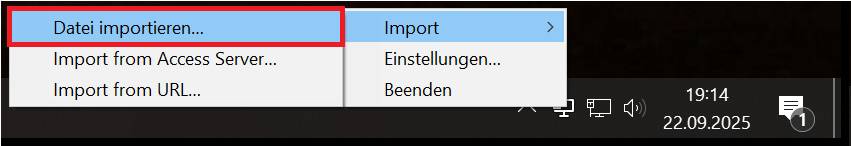 7. Konfigurationsdatei importieren. Klicken Sie mit der rechten Maustaste auf das OpenVPN-Symbol im Infobereich (Taskleiste) und wählen Sie Import → Datei importieren.