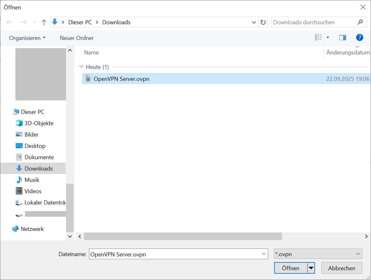 Wählen Sie die zuvor heruntergeladene Datei OpenVPN Server.ovpn aus und bestätigen Sie.