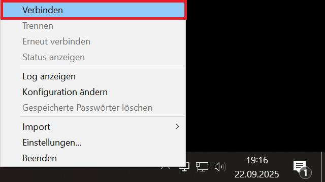 Die Verbindung kann jederzeit über das Taskleistensymbol getrennt oder erneut gestartet werden.