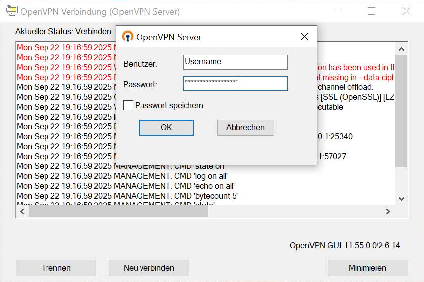 ❗ Achtung: Bei der Vergabe von VPN-Benutzernamen und -Passwörtern ist besondere Sorgfalt erforderlich. Unsichere Zugangsdaten können dazu führen, dass Unbefugte Zugriff auf Ihr internes Netzwerk erhalten.