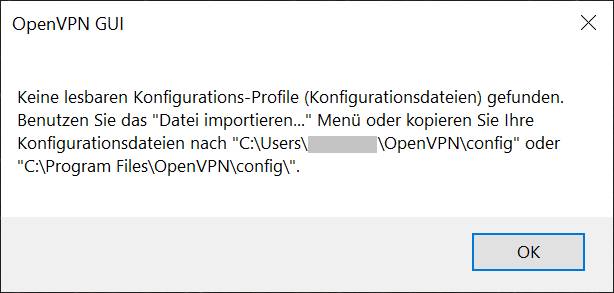 6. OpenVPN-Client starten. Nach der Installation starten Sie die OpenVPN GUI. Beim ersten Start erscheint ggf. die Meldung, dass keine Konfigurationsdatei gefunden wurde.