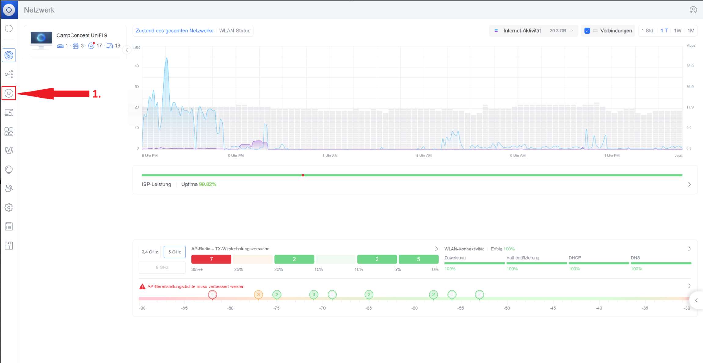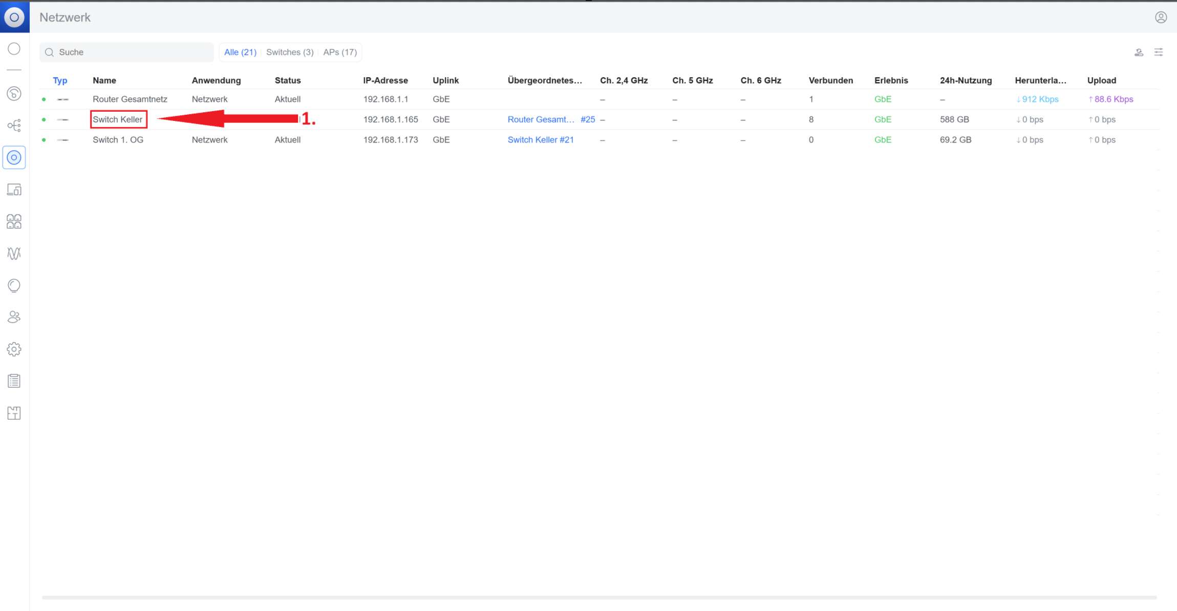 3. Switch auswählen. Klicke in der Geräteliste auf den Switch, an dem sich der betroffene Port befindet, z. B. „Switch Keller“.