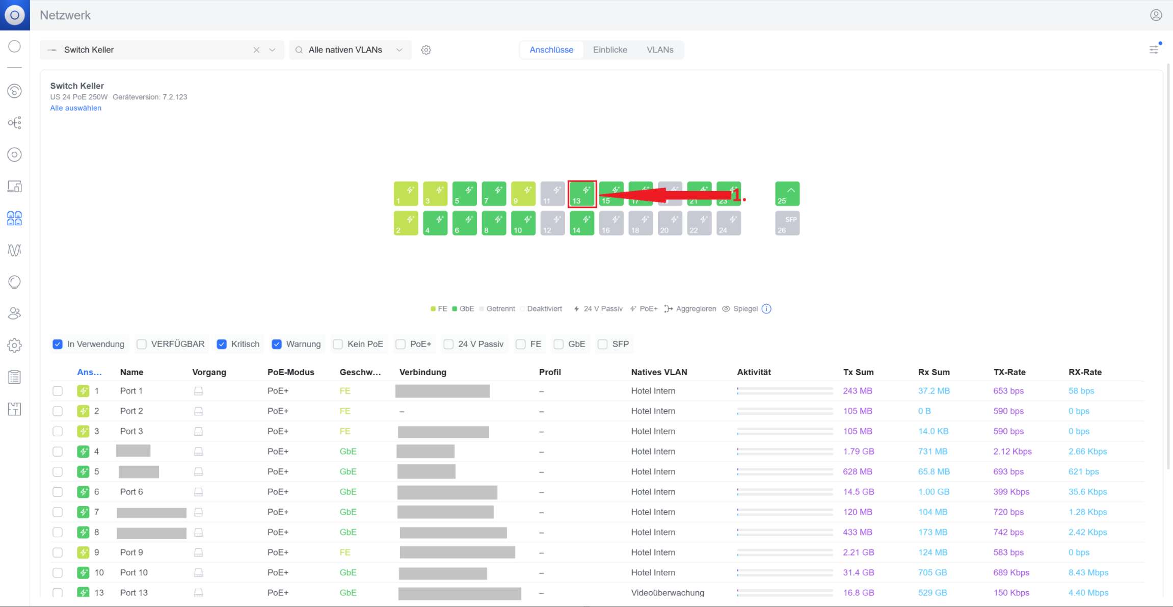 5. Port finden. Suchen Sie die Portnummer des angeschlossenen Geräts (z. B. Port 13).