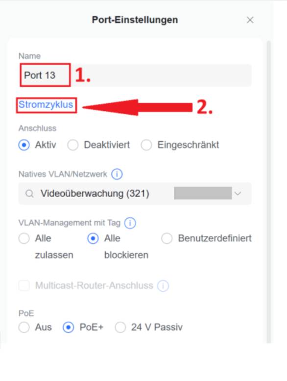 📘 Hinweis: Die Funktion Power Cycle steht ausschließlich für PoE-fähige Ports zur Verfügung. Falls die Option nicht sichtbar ist, prüfen Sie bitte, ob der Port PoE aktiviert hat oder ob Ihr Switch die Funktion unterstützt