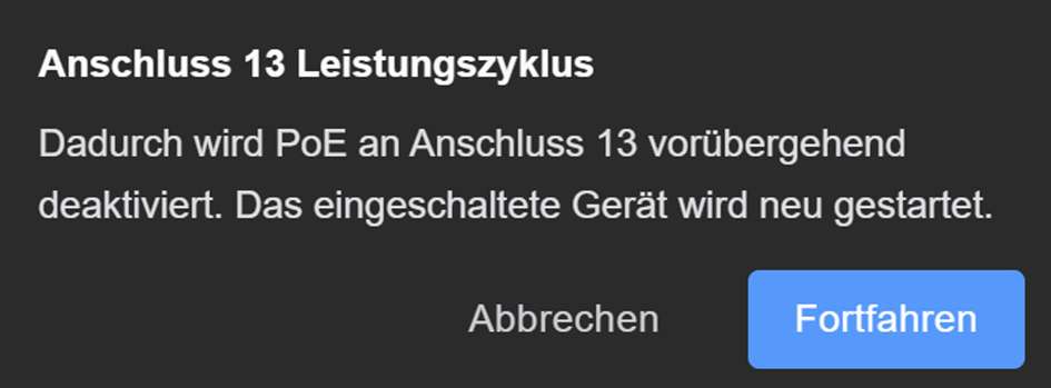 7. Warten & prüfen. Der Port wird kurz deaktiviert und wieder aktiviert. Warte Sie etwa 10...30 Sekunden und prüfen Sie, ob das Gerät wieder online kommt. Der erfolgreiche Power Cycle wird daran erkannt, dass der Port zunächst grau und anschließend wieder grün leuchtet. Ein grünes Licht zeigt an, dass der Port einen aktiven Link hat.